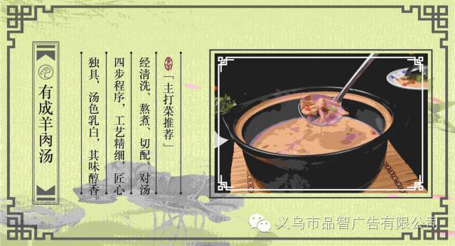 現(xiàn)代都市餐飲市場(chǎng)大都是經(jīng)營(yíng)快餐時(shí)尚飲食(中餐、西餐等),因而人們更加注重生活質(zhì)量及精神境界的提高,健康休閑式的特色主題餐廳是餐飲界的大趨勢(shì)。大眾對(duì)羊肉的認(rèn)知大多為冬季滋補(bǔ)佳品, 食補(bǔ)功效顯著。而在有成鮮,羊肉乃四季佳品。