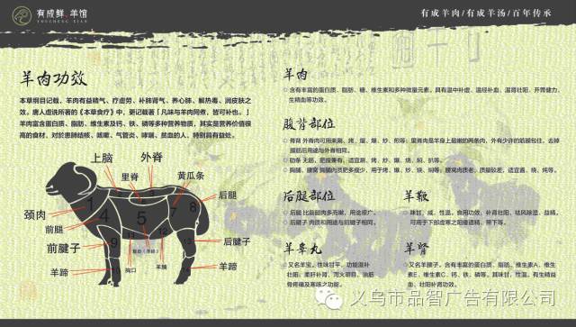 主題呈現(xiàn)羊肉的新鮮感,點(diǎn)綴以健康的綠色,結(jié)合傳統(tǒng)的深色調(diào),色彩平衡且符合餐廳主題。