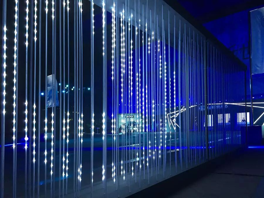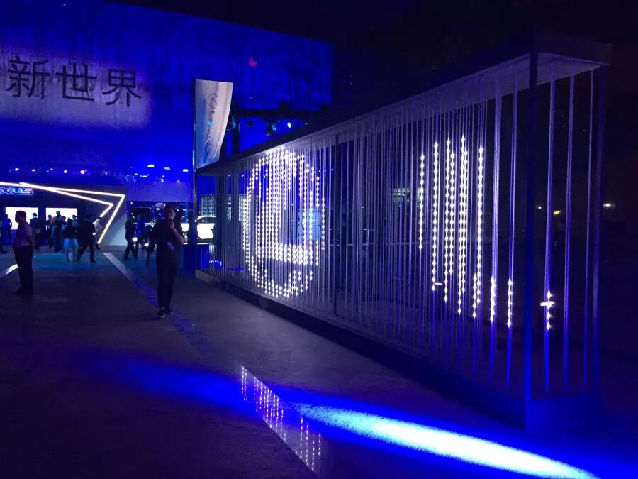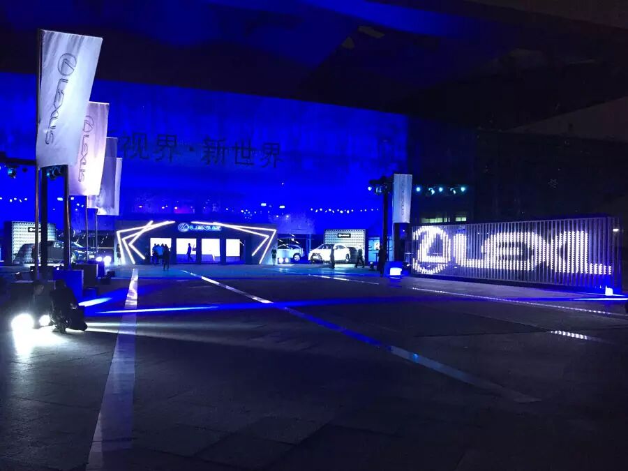 在外場(chǎng)的左側(cè),矗立著一幅大型的LED三維顯示視覺裝置。該裝置采用的是彩立方的q-TUBE方案,以360度全角度顯示的LED細(xì)管構(gòu)成一個(gè)12米寬3米高1米深的空間矩陣。 以粒子凝聚、發(fā)散、變幻等3D效果展示了LEXUS的品牌LOGO及主題廣告語(yǔ),在風(fēng)格上側(cè)重科技感、現(xiàn)代感和藝術(shù)感的結(jié)合, 既突出三維顯示的特質(zhì),又刻意保留非常良好的視覺通透性,與整個(gè)場(chǎng)館的燈光、布景完美配合,精彩地展示了客戶的品牌形象。