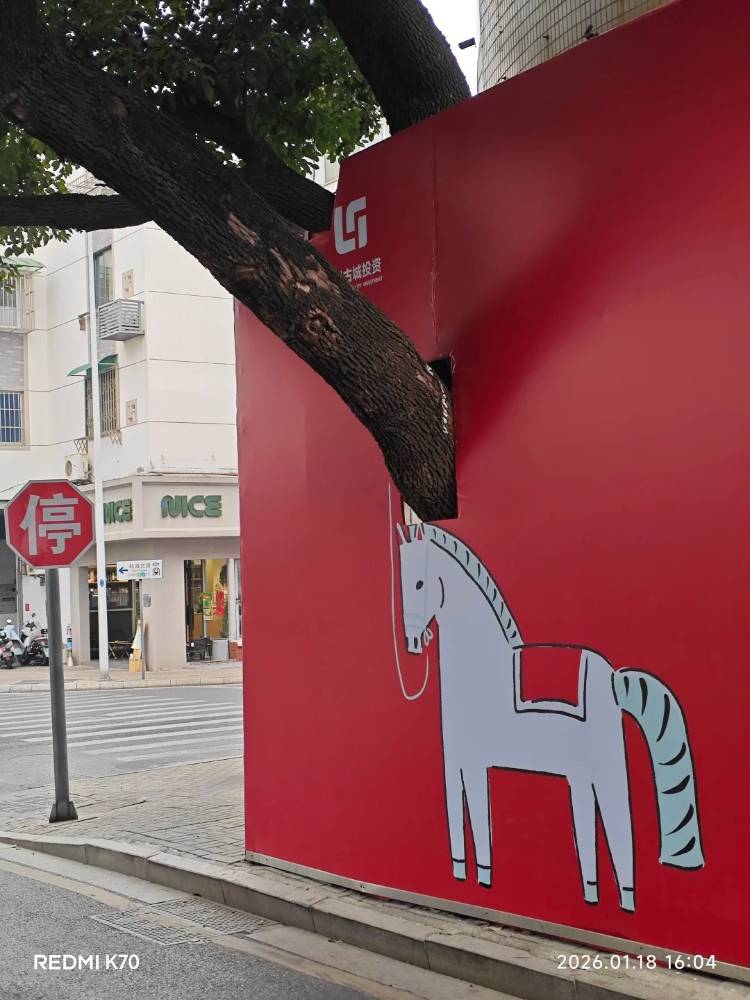 因?yàn)檫@里有顆樹,所以圍擋上開了一個(gè)口,把樹露出來